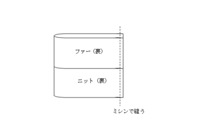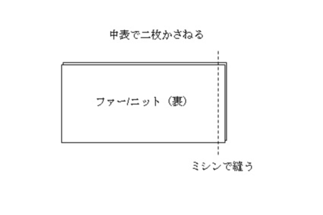 (1)で縫い合わせたファーとニット生地を中表にあわせ横長の上部分を縫います。